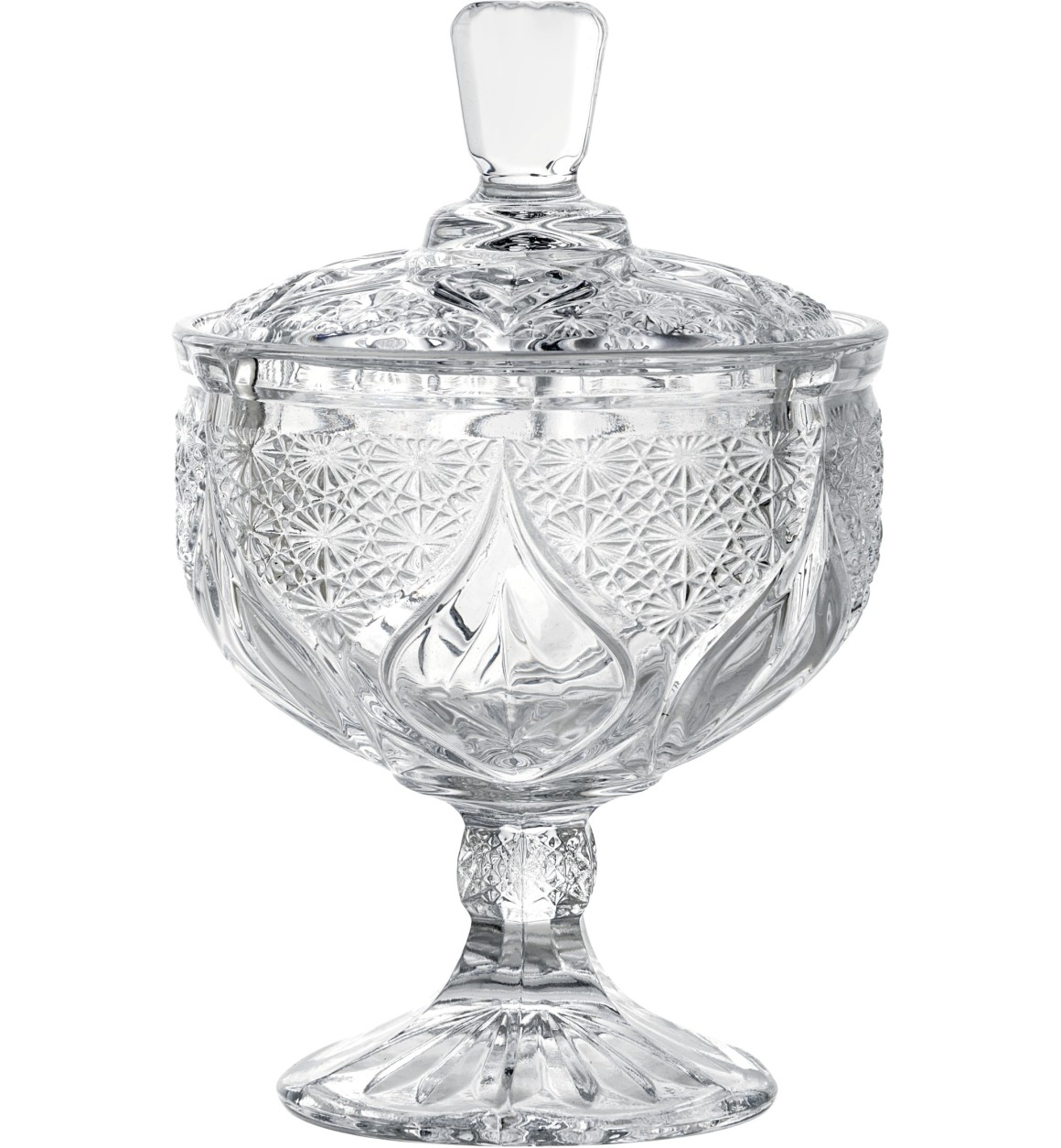 A Bomboniere com tampa e pé em vidro, adornada com detalhes em relevo, é um
