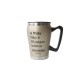 Caneca inox com frase e alça em plástico com excelente ergonômia e tampa com boa vedação.