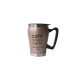 Caneca inox com frase e alça em plástico com excelente ergonômia e tampa com boa vedação.