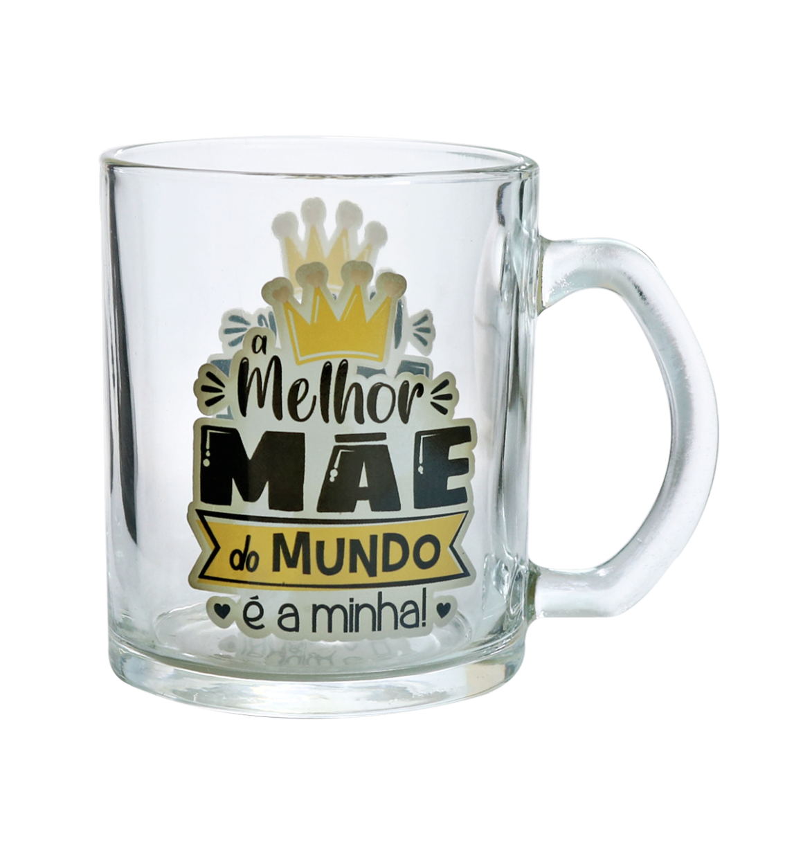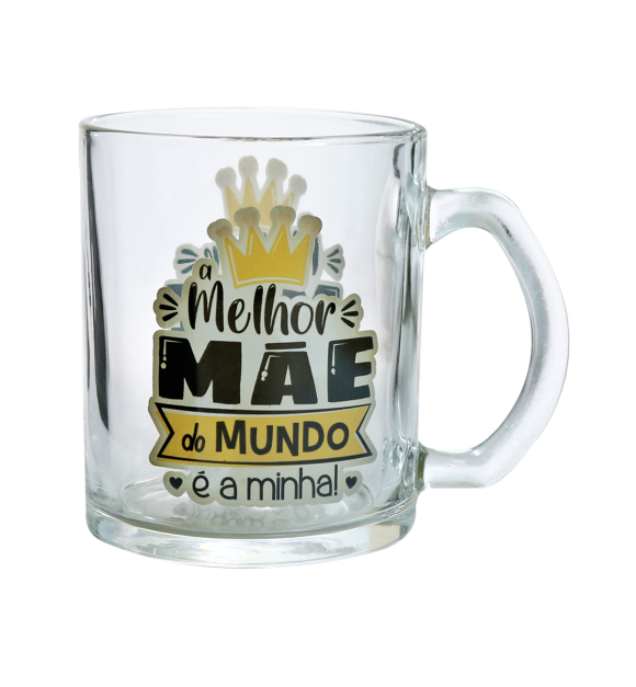 Caneca de vidro transparente com a frase "A Melhor Mãe do Mundo é a Minha".
