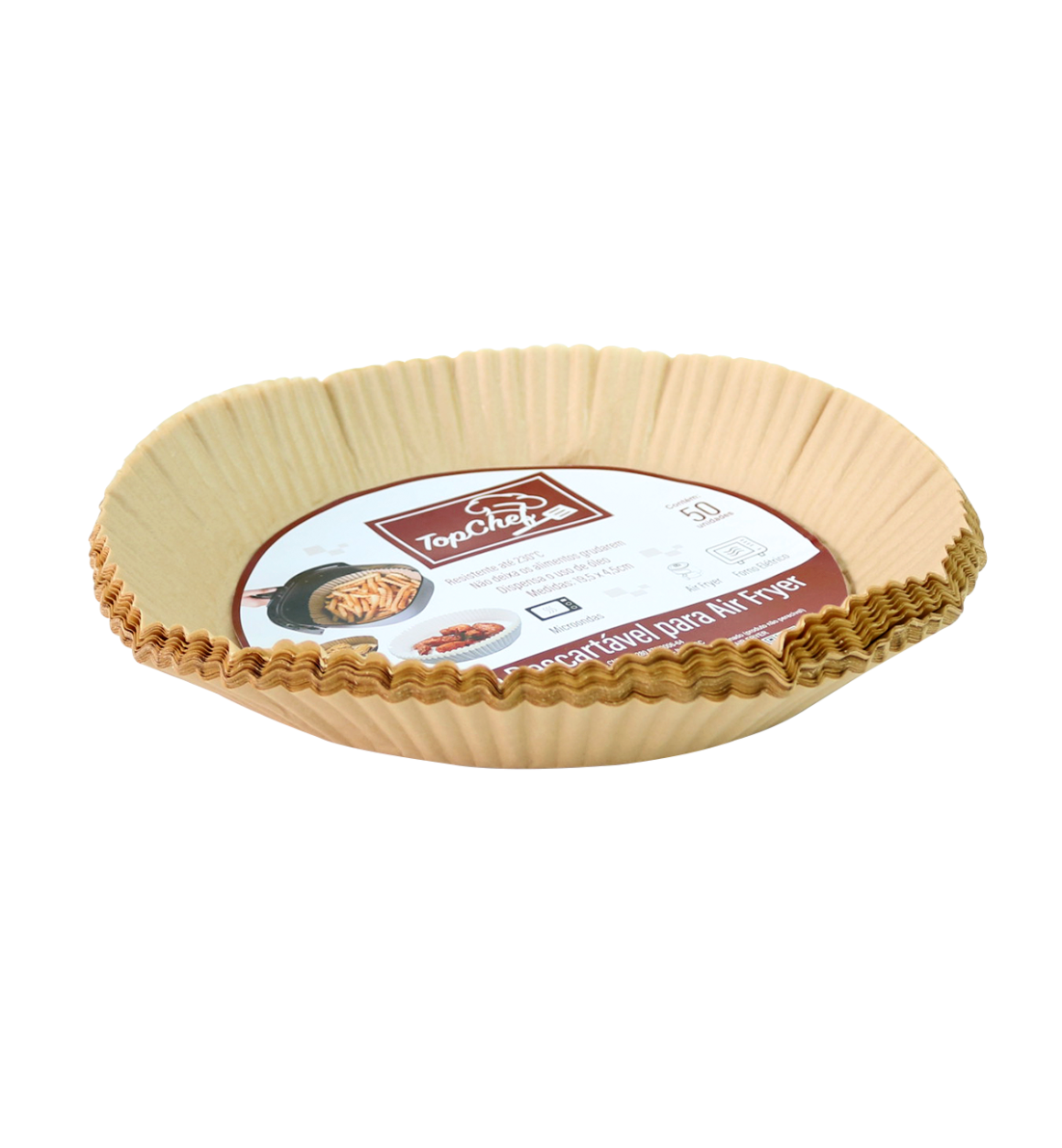 O formato do nosso papel se assimila a uma "forma redonda" e se encaixa bem nos air fryers do mercado, atendendo o equipamento até 8 litros.