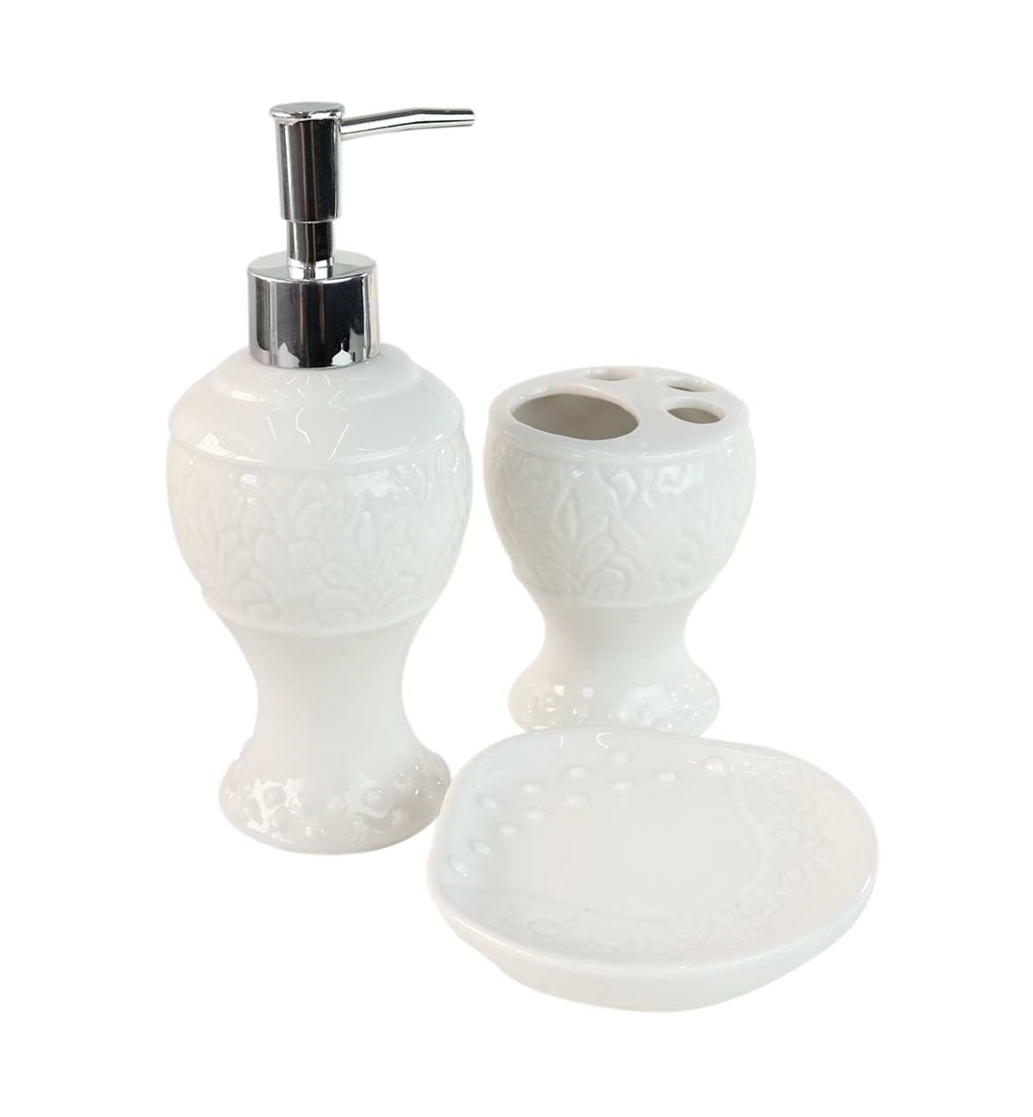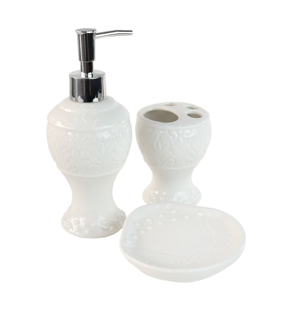 O toque que faltava na decoração do seu banheiro. O Jogo possui três peças confeccionadas em porcelana com design diferencial na peça trabalhada.