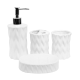 Kit para banheiro de cerâmica é ideal para manter seu banheiro ou lavabo e limpo é feito de cerâmica com desenho em relevo e composto por 04 acessórios, sendo 01 porta sabonete líquido, 01 porta escovas, 01 porta pasta e 01 porta sabonete em barra. Possui design moderno e elegante.
