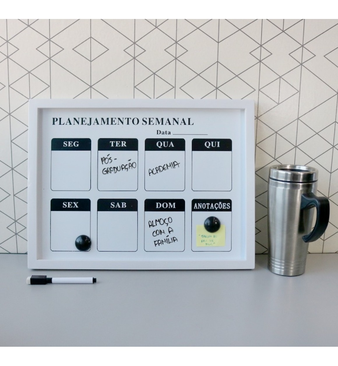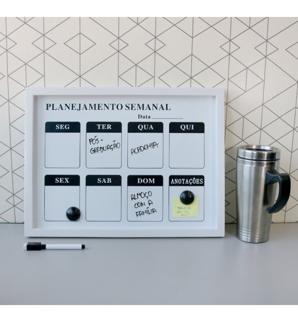 A lousa magnética de planejamento semanal é uma ferramenta prática e versátil para organizar suas tarefas e compromissos ao longo da semana. Com um design funcional, essa lousa oferece uma superfície de escrita suave e também possui a capacidade de fixar notas ou lembretes por meio de ímãs.