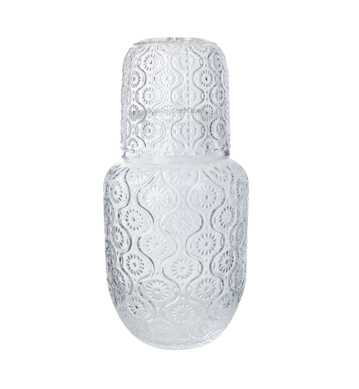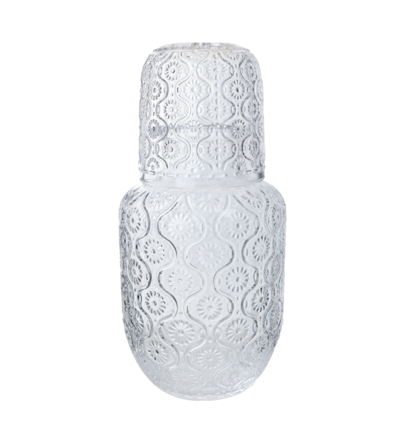 Beleza e praticidade para o seu dia a dia! A moringa é feita em vidro transparente com delicado relevo floral, que traz charme e elegância à mesa de cabeceira, escritório ou ambientes de recepção. Acompanha um copo de 145ml que se encaixa perfeitamente sobre a moringa, funcionando como tampa e economizando espaço. Ideal para manter água sempre à mão com estilo.