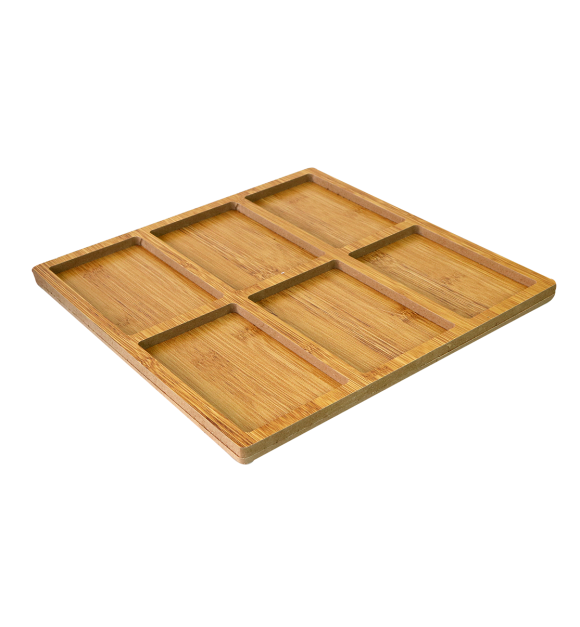 Petisqueira de madeira quadrada como 06 divisórias é perfeita para servir petiscos.A madeira possui o tamanho e leveza ideal para ser utilizado em várias situações.
