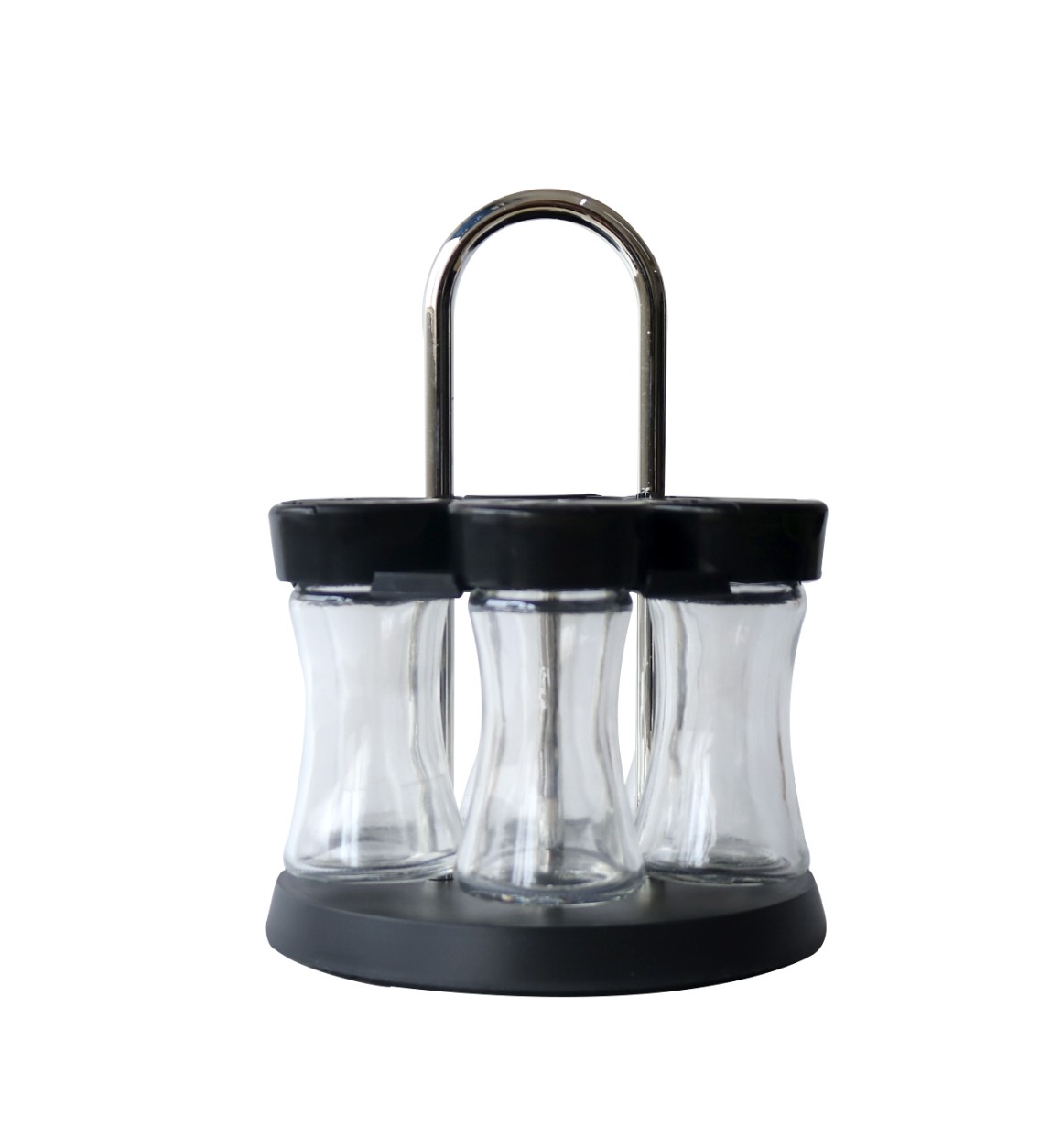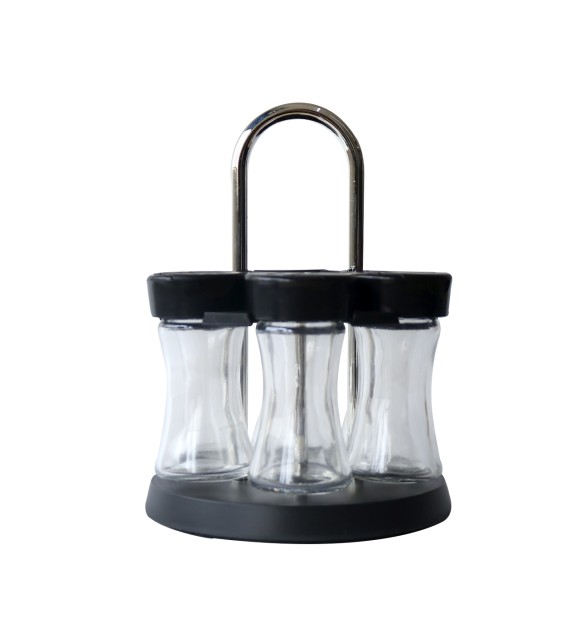 Porta condimentos com estrutura giratória em plástico com Potes em vidro e tampas plásticas. Ideal para organizar temperos além de deixar o ambiente mais sofisticado.