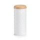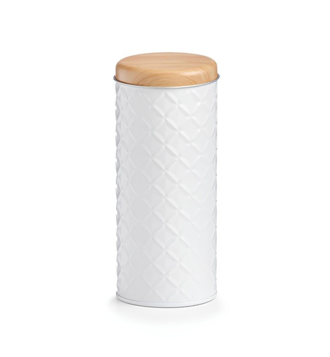 O pote metálico branco é todo feito em metal, com a tampa lisa com estampa padrão madeira, e sua parte inferior tem bonito alto relevo geométrico que dá um efeito muito decorativo a peça.