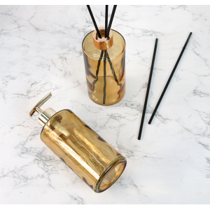 KIT FRASCO DIFUSOR COM PORTA SABONETE LIQUIDO DE VIDRO 340ML - 96146-AMBAR. O kit difusor contém 01 porta sabonete líquido e um frasco difusor com 5 varetas. O pump do porta sabonete líquido é dourado. A tam...